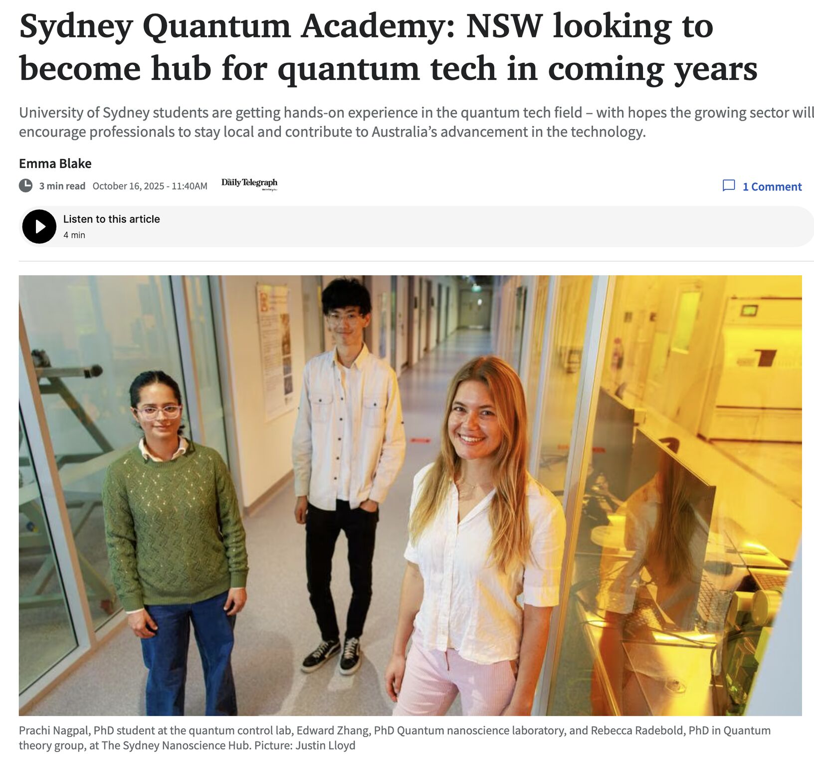 THE DAILY TELEGRAPH | Students are getting hands-on experience in the quantum tech field – with hopes the growing sector will encourage professionals to stay local and contribute to Australia’s advancement in the technology